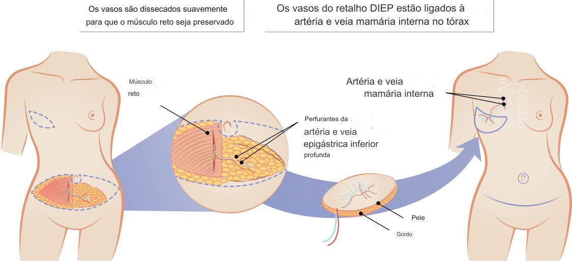 DIEP é a técnica microcirúrgica mais avançada de reconstrução mamária, que permite utilizar unicamente a pele e a gordura do abdómen, sem lesionar nenhum músculo e sem utilizar nenhum material estranho para o corpo humano (implantes mamários).